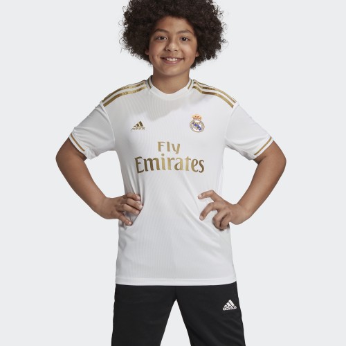 "Реал" вступає в сезон європейських королів із елегантним домашнім набором, який відповідає їхньому царському статусу. Футбольна футболка для юніорів виконана з блискучими золотими акцентами на класичному білому тлі. Виготовлений з тканини, що відбирає піт, з шовковистим відчуттям. Призначений для вболівальників, він має трохи більш вільний крій, ніж майки, які гравці носять у день гри. '