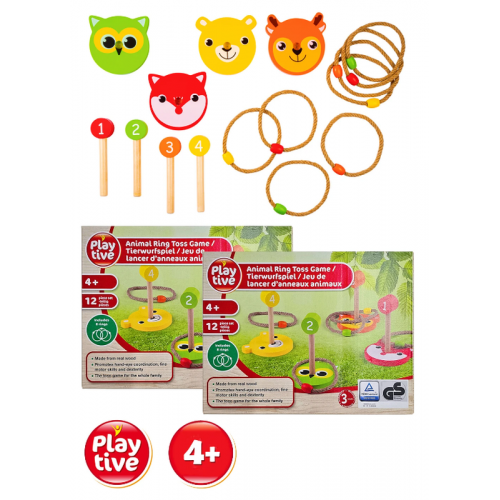 Гра складається з 12 предметів, 8 з яких це кільця для метання та 4 фігурки виготовлені з натурального дерева.