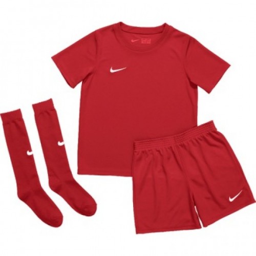 Комплект дитячої ігрової форми для занять футболом Nike Dry Park Kit складається з футболки, коротких шортів і гетр. Технологія Dri-FIT відводить вологу та забезпечує сухість та комфорт. Шорти мають еластичний пояс. Матеріал: 100% поліестер