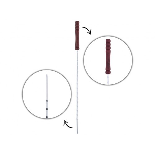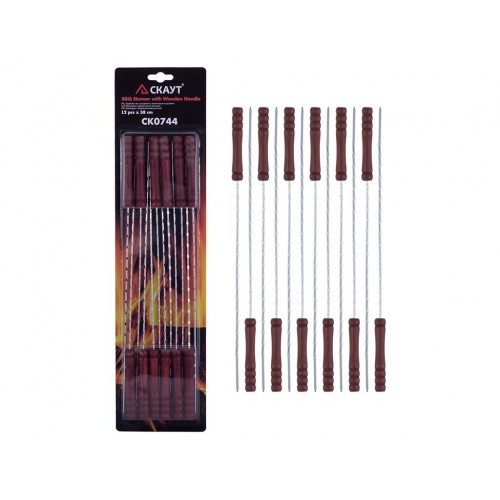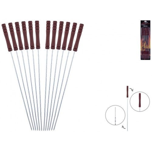 Кількість в наборі: 12шт. Матеріал шампура: хромована сталь. Розмір шампура: 28,5х0,25см. Матеріал ручки: дерево. Розмір ручки: 9,5х1,5см. Гостра заточка для зручності нанизування. Упаковка: блістер 49,8х12,5х1,5см.