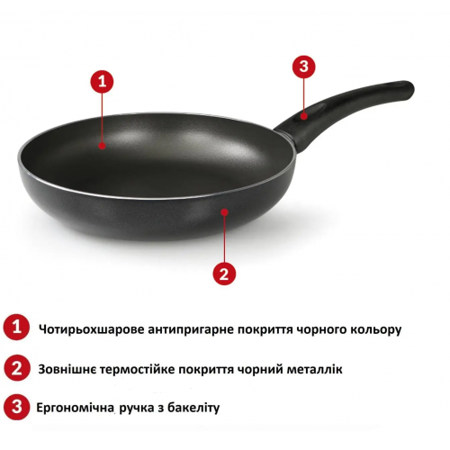 4-LAYER COATING - чотирьохшарове екологічно чисте мінеральне антипригарне покриття на водній основі, не містить шкідливих сполук перфтороктанової кислоти (PFOA), нікелю, та інших важких металів. Цілком безпечне для людей, що мають алергію на важкі метали. Для приготування їжі в посуді з даним антипригарним покриттям достатньо додати мінімальну кількість олії, або можна її взагалі не використовувати, отже їжа після приготування лишається здоровою і корисною.